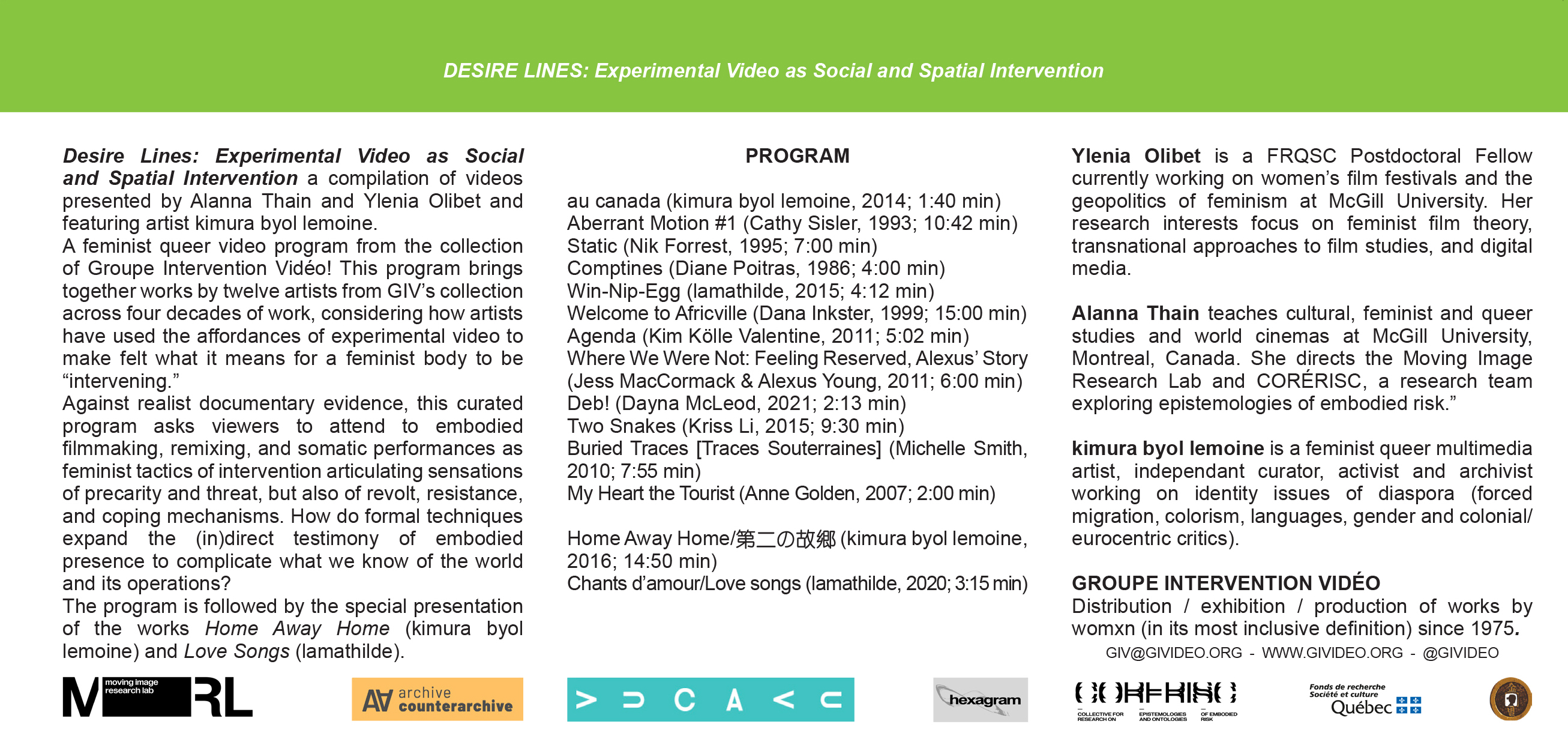 This program presented by Alanna Thain and Ylenia Olibet, brings together works by twelve artists from GIV’s collection across four decades of work, considering how artists have used the affordances of experimental video to make felt what it means for a feminist body to be “intervening.”