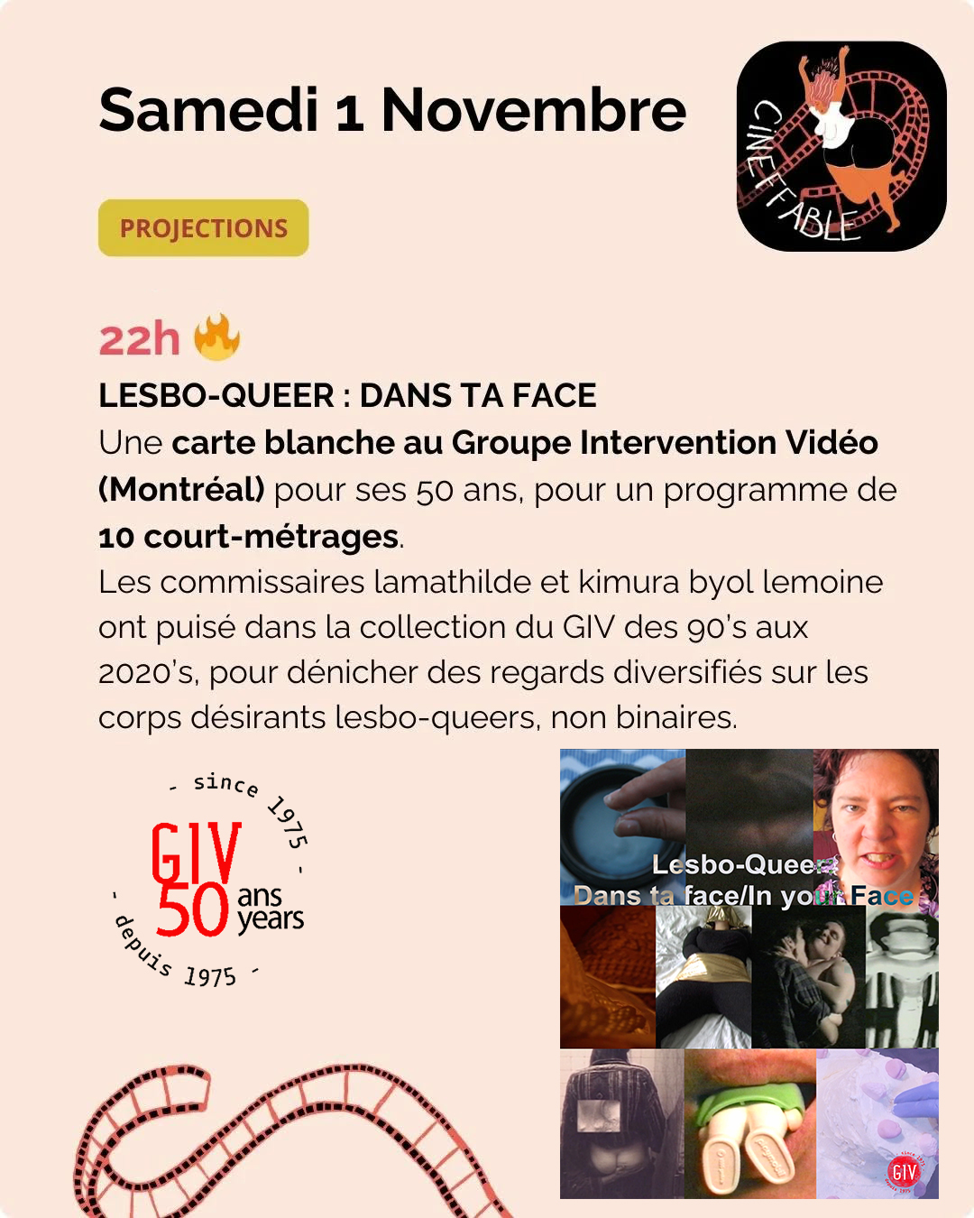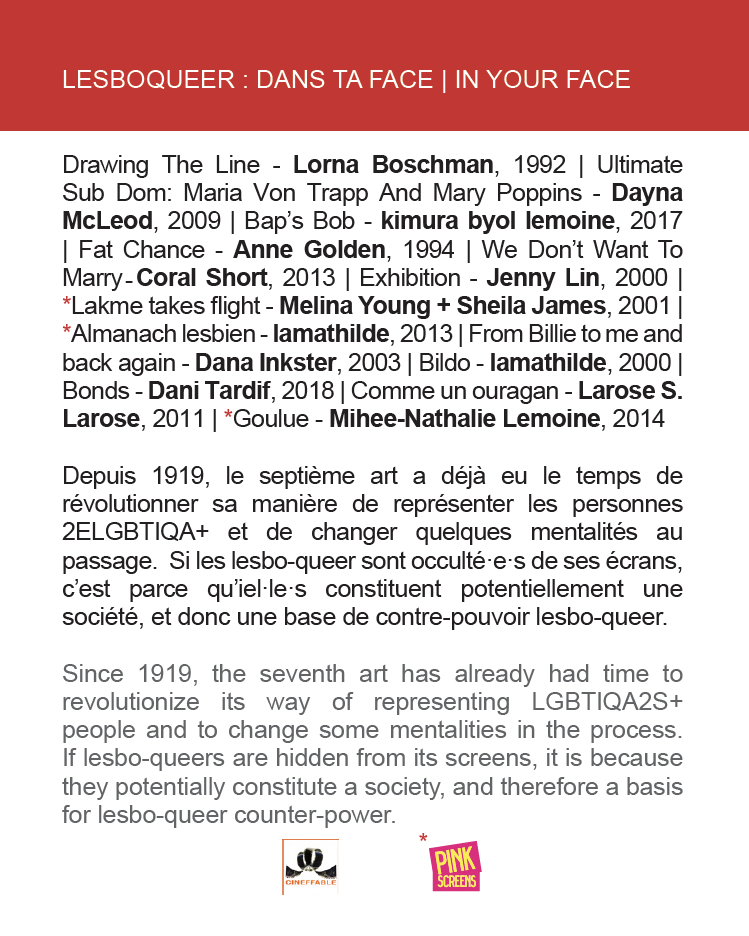Dans le cadre du Festival Cinéffable, ce programme d’une heure est co-commissarié par deux artistes lesbo-queer distribué.e.s par le Groupe Intervention Video (GIV) qui fête ses 50 ans de distribution.