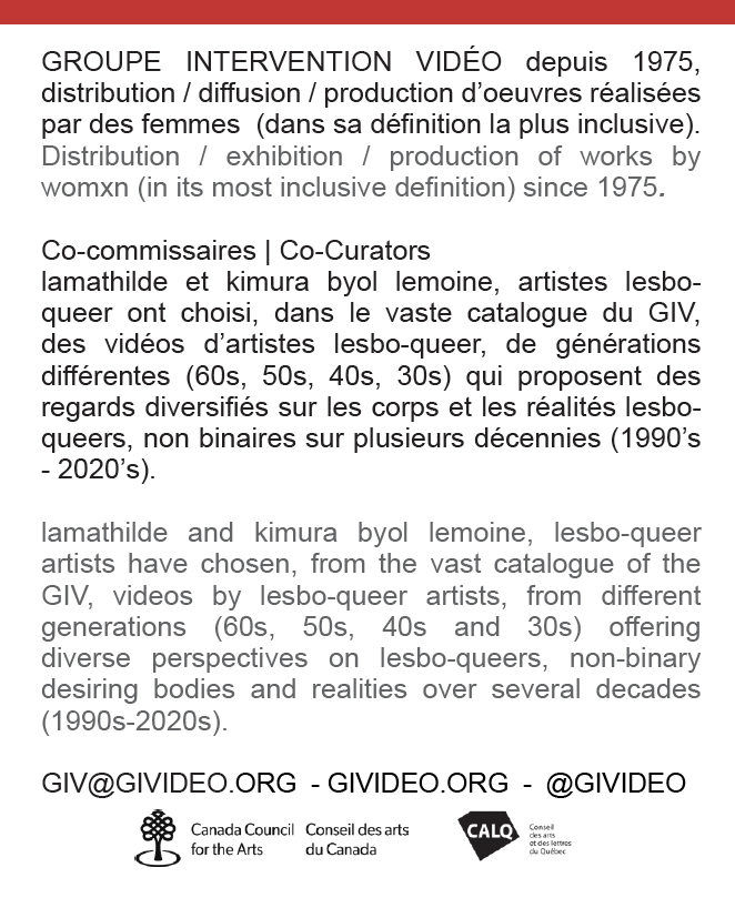 lamathilde et kimura byol lemoine ont puisé dans la vaste collection de vidéos, et propose des regards diversifiés sur les corps désirants lesbo-queers, non binaires dans la collection du GIV des 90’s aux 2020’s.