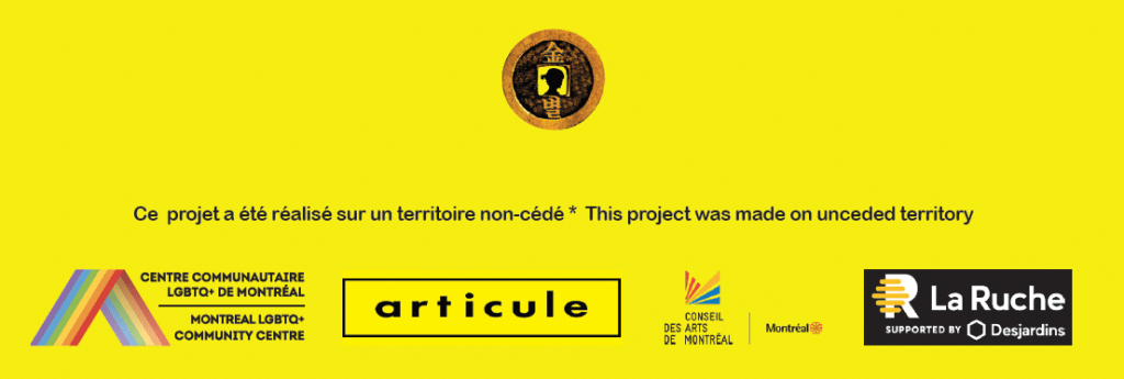 This project would not have been possible without the artists, Nedjma Achour (La Ruche), Cécilia Bracmort, Sabrina Cordy, Angelina Guo, André Ho (Montreal LGBTQ+ community Center and Jeunesse Engagée), Tong Zhou Lafrance (Design), Michaëlle Sergile (articule).