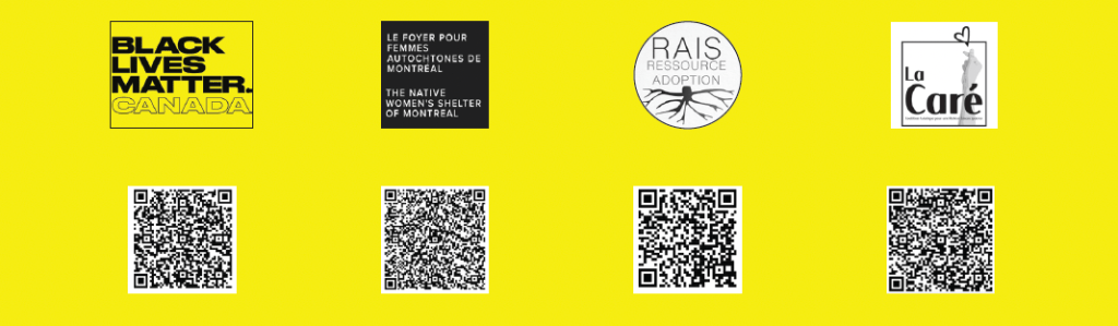 With this publication, the chosen artists were touched by these racist events (anti-Asian, anti-Black and towards Indigenous people). The QR codes on the back of the postcards direct you to the selected artists’ work and those on the side lead you to the donation pages for the organizations: Black Lives Matter Canada (BLM), The Montreal Native Women’s Shelter, La Caré and the RAIS — Adoption Resource.