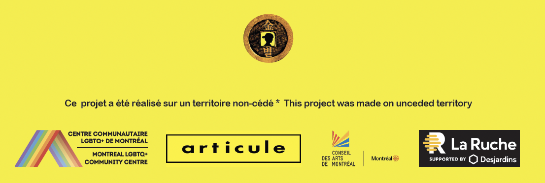 This project would not have been possible without the artists, Nedjma Achour (La Ruche), Cécilia Bracmort, Sabrina Cordy, Angelina Guo, André Ho (Montreal LGBTQ+ community Center and Jeunesse Engagée), Tong Zhou Lafrance (Design), Michaëlle Sergile (articule).