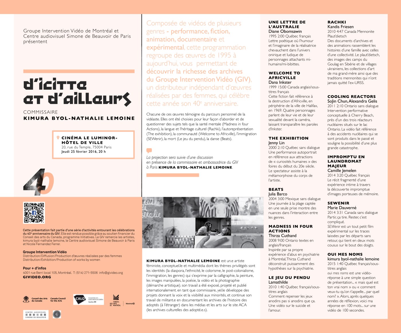 40 ans ça se fête ! Pour cet événement, le G.I.V. propose un programme de vidéos courtes réalisées et/ou distribuées au Canada par des femmes. Ce survole de presque 20 ans (de 1995 à 2014), permet de redécouvrir la richesse des archives de ce centre auto-géré qui a pour mandat de rendre visible un travail considérable de vidéos.
