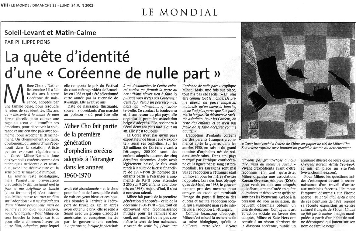 Le sourire reste nostalgique, mais l’amertume provocatrice d’autrefois (“Ma coréanité sent la frite et ma belgitude sent le Gimchi [chou fermenté]”) s’est estompée. Mihee pense tourner un film sur l’adoption: “Il ne s’agirait pas d’une histoire personnelle, mais de peindre ce par quoi nous passons, nous, les adoptés.” Pour Mihee, ce sera boucler la boucle, car tout pour elle a commence avec un autre film, Adoption, pour lequel elle remporta le prix du Festival du court-métrage video et Super * de Bruxelles en 1988 et qui a été sélectionné cette année par la Biennale de Gwnagju. Elle avait 20 ans.