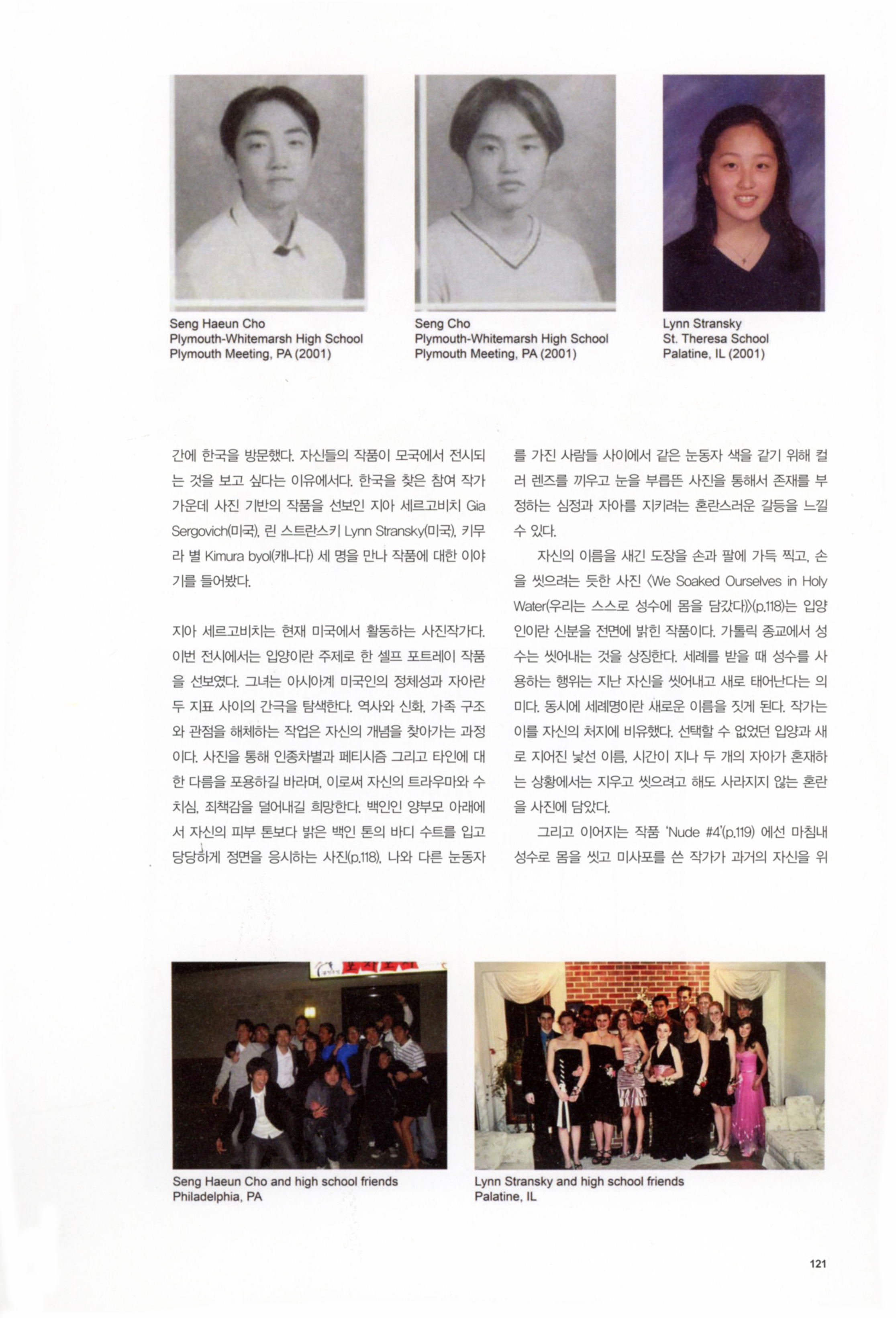 Llyn Stransky was only able to see a few photos through her brother’s Facebook page, and developed her work while imagining what her life would have been like had she not been adopted to the United States. They cut and paste a picture of themselves next to a picture of their mother taken on the subway (p.120) or paste an ID picture of themselves taken in the same year next to the graduation picture of the school where the two older brothers attended (p.123). She had two older brothers, but one died in a car accident). It shows the situation and feelings of the artist who found his family but couldn’t belong there. Also, a group photo of her brother taken with Asian friends and a group photo of herself taken with Caucasian friends are placed side by side. It reveals the fact that they lived very different lives even though they were brothers.