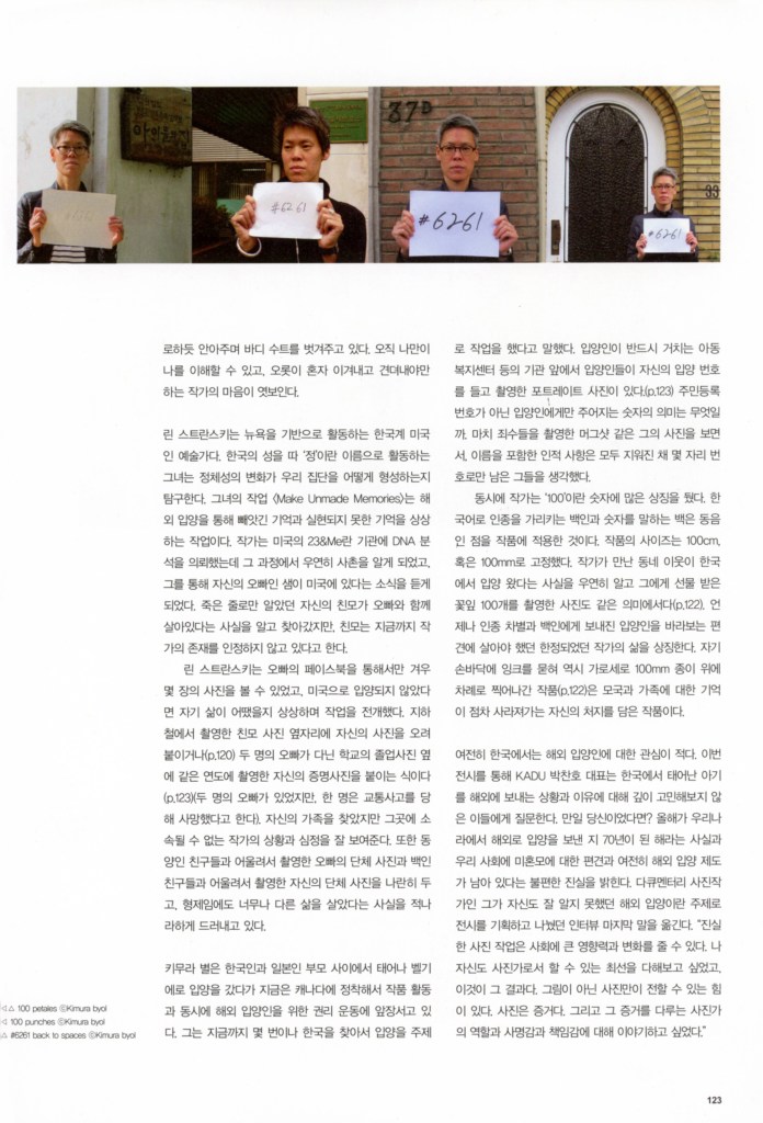 kimura byol (lemoine) was born of Korean and Japanese parents, was adopted in Belgium, and now settled in Canada. Ze said that he had visited Korea several times and worked on adoption as a theme. There is a portrait photo of adoptees holding their adoption number in front of an institution such as a child welfare center that adoptees must go through (p.123). What is the meaning of the numbers given only to adoptees, not resident registration numbers? looking at zer picture, I thought of them with only a few digit numbers remaining, with all personal information including names erased.