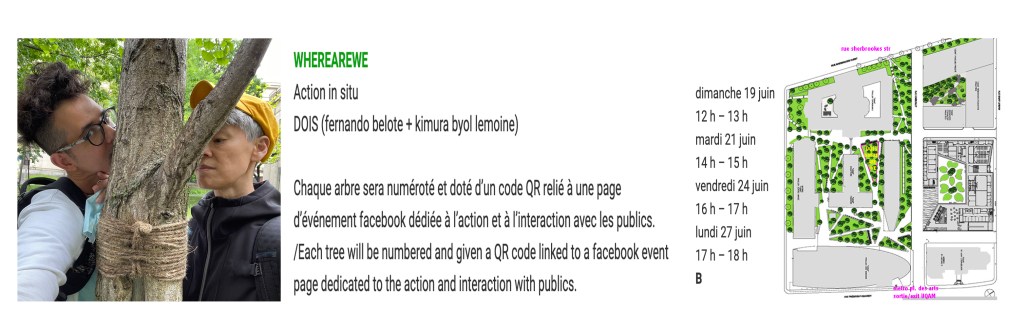 Le corps de kimura-lemoine habillé.e en ouvrier.e (jardinier.e) et la voix de belote s’immisceront sur le site pendant quatre jours pour sensibiliser les publics aux déplacements forcés — autochtones, réserves, rafles des années soixante, camps d’internement de Japonais∙e∙s, adoptions internationales, trafics humains, etc.— en numérotant et en renommant les arbres (humain/immigration) et incluant le nettoyage du site (labeur), le shibari (retenue/pouvoir, étiquetage et cordon) et l’identification des arbres.