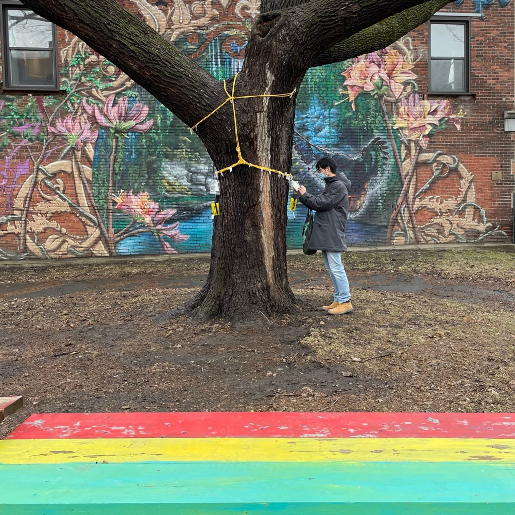 Description : MEAREWE, which will be deployed over 100 days in the space of Sainte-Cunégonde Park, is intended to be a participatory experience between the artist duo and the public. The installation will evolve over time and will be punctuated by several interventions: ‹on the left› is the “secret” tree where you can whisper your secret(s) in the cracks of the tree’s skin, as we do in Asia ; ‹on your right› a big tree will welcome you to write your wishes on rice paper that you will fold and tie to the string placed on the trunk of the tree; ‹on the HALTE› phrases in P(b)ajubá will celebrated with a poem bixa, a balado with artists; renata paciullo ribeiro, Gong Li, Anne-F Jacques, and an exclusive conversation with Brazilian activist Neon Cunha.
